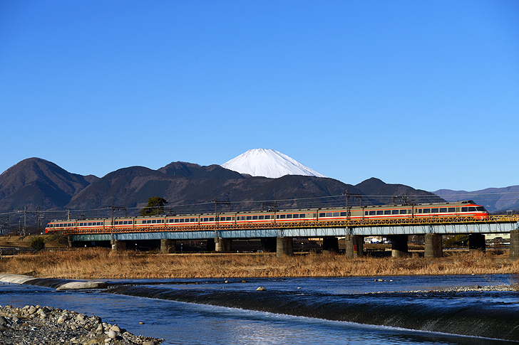 「一富士、二鷹、三茄子」は、初夢で見ると縁起の良いものトップ3を詠った江戸の諺だが、鉄ちゃん的に鉄初めで撮れると嬉しいのは何といっても秀峰富士の雪化粧。とはいえ、1年で最も日の出の遅いこの時期は、富士山がスッキリ見える朝方にきれいに影が抜ける撮影地はなかなかない。そんな中、開けた場所で早朝から朝日が当たる貴重な場所が小田急の酒匂川橋梁だった。当時恒例だった中国三道嶺ツアーから帰国した翌週末、縁起ものの鉄道情景を狙いにこの場所へ。LSEの引退が迫った時期だけあって、身内を含めて10名以上が集結した。先行電車を見送ること数本、満を持してロマンスカラーの連接特急が檜舞台に登場。過去に幾度か撮ってはいるが、銀嶺クッキリの最高条件にめでたい気持ちでシャッタを押したのだった。