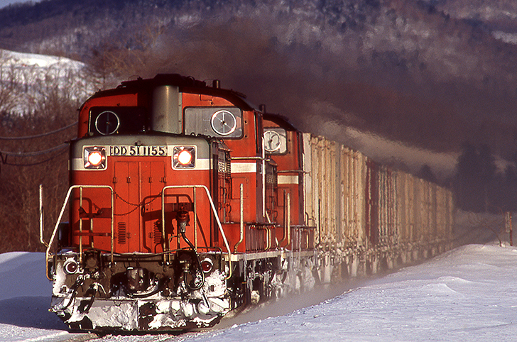 生田原から林道に入り、峠を目指す。だが、期待に反して除雪されていたのは途中の釣り堀まで。ここから146kpまでは雪中行軍で約2kmの道のり。この時間からハスキーにペンタフルセットの銀箱では、列車通過までに辿り着けるかいささか怪しかった。ならば今日は直線区間をアップで狙おう。牧場脇の踏切に本命ペンタ300とサブ機のF4s+サンヨンを構える。待つこと30分余り、鋭い朝の光線が白い道床を照らし始めた頃、遠方からエンジンの唸りが聞こえてきた。猛烈なスピードで峠へのアプローチに挑むダブルヘッダーのDDがオレンジの光線に鈍く輝く!望外の原色重連にレリーズを持つ手が思わず震えた。