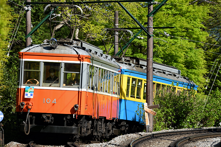 コロナ禍の頃、遠出が憚られる中で比較的近場の箱根登山鉄道にはよく出掛けていた。観光客が激減していることもあり、道中はいたってスムーズ。自宅から1時間半もあれば撮影地の大平台に到着できた。先週までは3連だった旧型編成が、今日は108を落として2連で運転とのこと。普段なかなか見られないシールドビームの104号の前パン姿が拝めるということである。朝から各所を回って午後のメインは大平台入線。入場券を購入し、ホーム端に300oをセットする。15時過ぎ、眩い新緑に包まれた急勾配を赤・青の2連が車輪を軋ませながらゆっくり登って来た。これはこれで良かったが、一昨年には106号が標準塗装に戻されたというし、近いうちに今度はオール赤の3連でこんなカットを撮ってみたいものである。 |