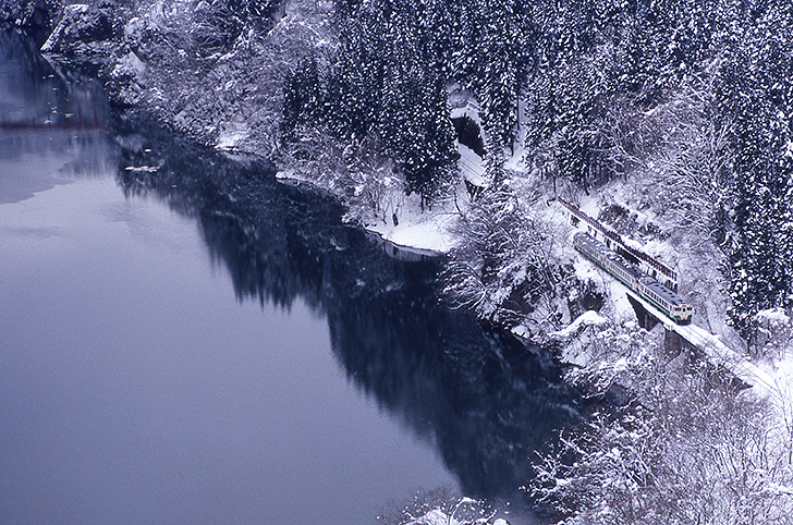 経路は不明ながら、当時の手帳によると盛から会津若松まで移動して寝袋にくるまりマルヨ。次の日は、冴えない天候ながら早戸の俯瞰に来ていた。曇天続きで戦意も低調だったのか、機材は控えのOM−1で、フィルムはお試しで装填したエクタクローム100プラス。85oのヨコ構図で、キハ40の3連にシャッターを切った。丸3日も真冬のみちのくを彷徨って、納得できるカットはゼロ。何と取れ高の少ないツアーだったのか。当時の若さとチャレンジ精神に驚く。 とはいえ、大空振りにやられた心の傷も癒えた今、振り返ってみると只見線の曇天の1枚も悪くない。雪晴れを期待しているから及第点に満たないように見えるけれど、モノトーンの落ち着いた雰囲気の中、静かな川面を横目に滑るように走り去る国鉄型気動車も味わい深いではないか。ま、これもハイブリッドのステンレスキハばかりになってしまった現在だからこそ半ば感傷的に思い出フィルターを通して評価しているだけかも知れないが…。もう時間は巻き戻せない、これで良かったことにしておこう! |