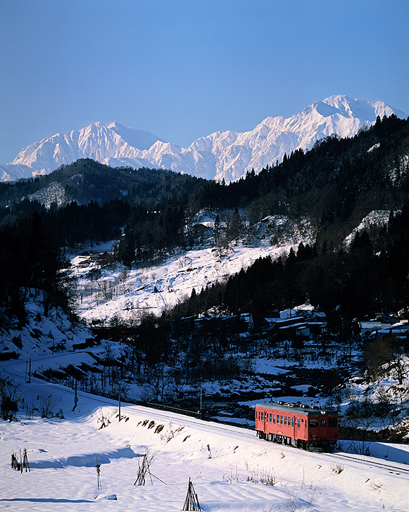 夜明けとともに、南小谷の宮本踏切に機材をセット。姫川の渓谷の背後には、北アルプスのピークが青空をバックに凛と聳えていた。思えば初めてこの場所でキハ52を撮影したのは2001年秋、DD16のラッセル試運転を撮りに来た時だった。当時はまだ復活国鉄色など始まっておらず、白地に緑帯の“大糸色”だったが、霜で銀色に染まった線路に朝日が差し込み、北アルプスの稜線を背に颯爽と駆けてくるベテラン気動車の姿に魅せられたものだった。今日は雪景色にタラコ色、もう最高である。間もなく踏切が鳴り、朱色5号の懐かしい姿がファインダーにゆっくりと現れた。 休みの度に日本海側の天気を気にして、千載一遇の雪晴れチャンスを虎視眈々と狙っていたのも今は昔。一昨年に車を買い替えてからは、財布の都合で冬用タイヤを諦めた。考えてみれば雪国に苦労してまで撮りたい被写体も大して思い浮かばない。振り返ると、昨年・今年と冬に狙っているのは銚子電鉄にスペーシアに8111Fと完全に関東地区の私鉄ばかり。もうかんじきを履いて雪中行軍をするというウィンタースポーツに興じる機会はやってこないのだろうか…。 |