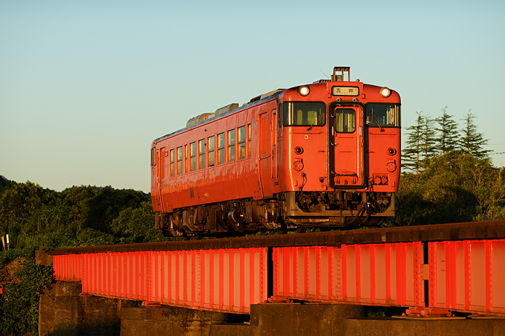 をグイっと回していざ勝負!文字通り日の出直後のベタエロ光線を浴びて、タラコ単行が鉄橋上に躍り出た。